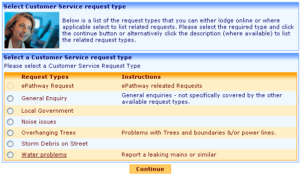 CustomerServiceTypes.aspxThe Customer Service Types page provides a Description, together with Instructional text for each Request Type that is available for request via the web.