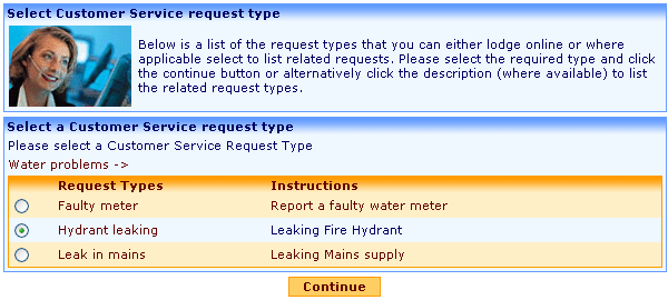 The user is able to select the type of request that they wish to lodge from the available list in each case above and in the example below several types are available for selection. In this case the user has selected the ?Water problems? link and then within that the ?Hydrant leaking? request type.